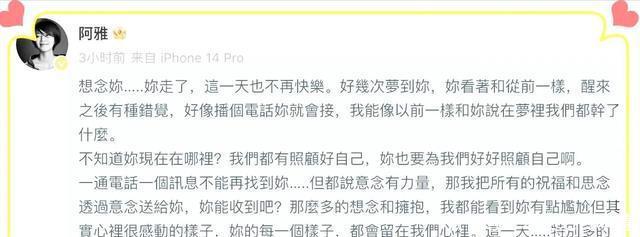阿雅发文称,想念你......你走了,这一天也不再快乐。开头一句话,就尽显姐妹情深,阿雅难得这般高调发文,看来是真的太念大S了。