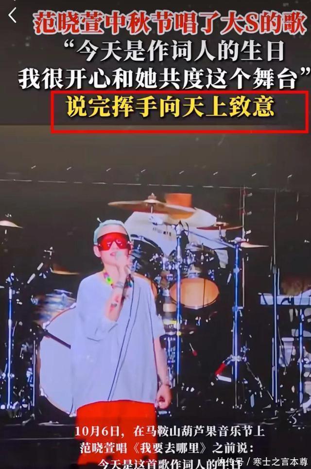 而另一边的范晓萱则在马鞍山葫芦果音乐节上唱了一首大S的《我要去哪里》,并当场说道 :“今天是作词人的生日,我很开心和她共度这个舞台!” 话音刚落,范晓萱便挥手向天上致意。